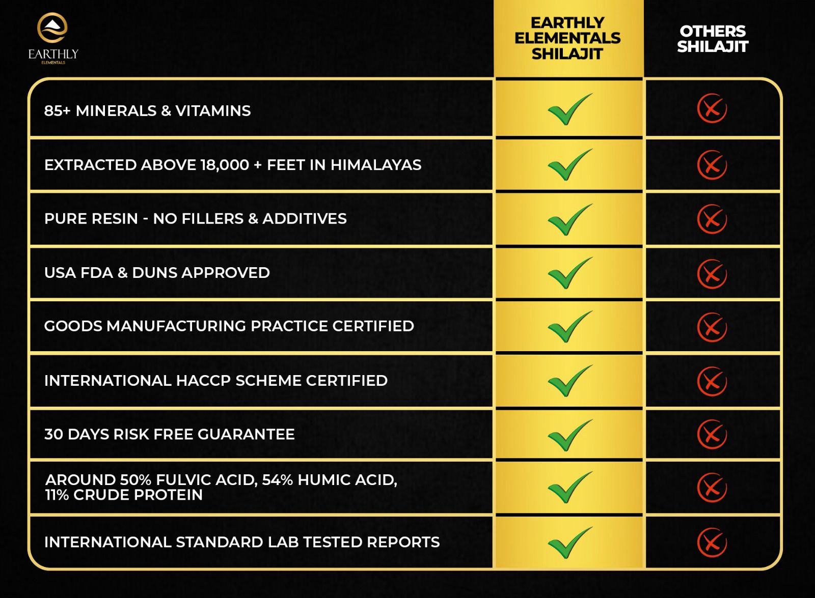 Earthly Elementals Shilajit undergoes stringent third-party labtesting and is manufactured under GMP-certified, FDA-registered, HACCP-compliant, and ISO 22000-certified facilities